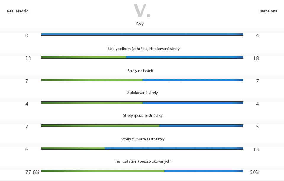 Barca má za sebou zápas snov. Katalánci zdolali svojho najväčšieho rivala na jeho vlastnej pôde rozdielom triedy. O góly sa postarali Neymar, Suarez (2) a Iniesta. O dominancii Barcelony presvedčujú aj štatistiky zo zápasu.