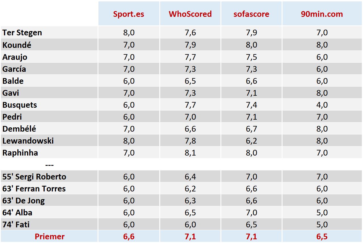 Hodnotenie hráčov bolo zostavené podľa nasledovného kľúča -> do úvahy sme brali 2 subjektívne zdroje: hodnotenie portálu 90min.com a hodnotenie katalánskeho denníka Sport a potom hodnotenie dvoch štatistických portálov Whoscored.com a sofascore.com. Pri každom hráčovi je priemer známok z týchto 4 zdrojov s komentárom portálu 90min.com. Kompletné čísla nájdete v tabuľke na konci článku.