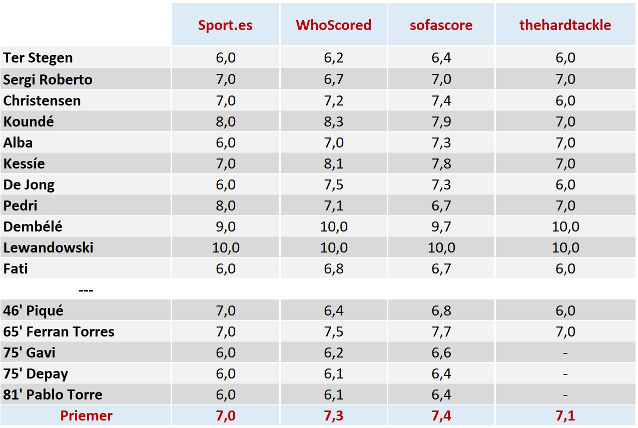 Hodnotenie hráčov bolo zostavené podľa nasledovného kľúča -> do úvahy sme brali 2 subjektívne zdroje: hodnotenie portálu thehardtackle.com a hodnotenie katalánskeho denníka Sport a potom hodnotenie dvoch štatistických portálov Whoscored.com a sofascore.com. Pri každom hráčovi je priemer známok z týchto 4 zdrojov s komentárom portálu thehardtackle.com. Kompletné čísla nájdete v tabuľke na konci článku.