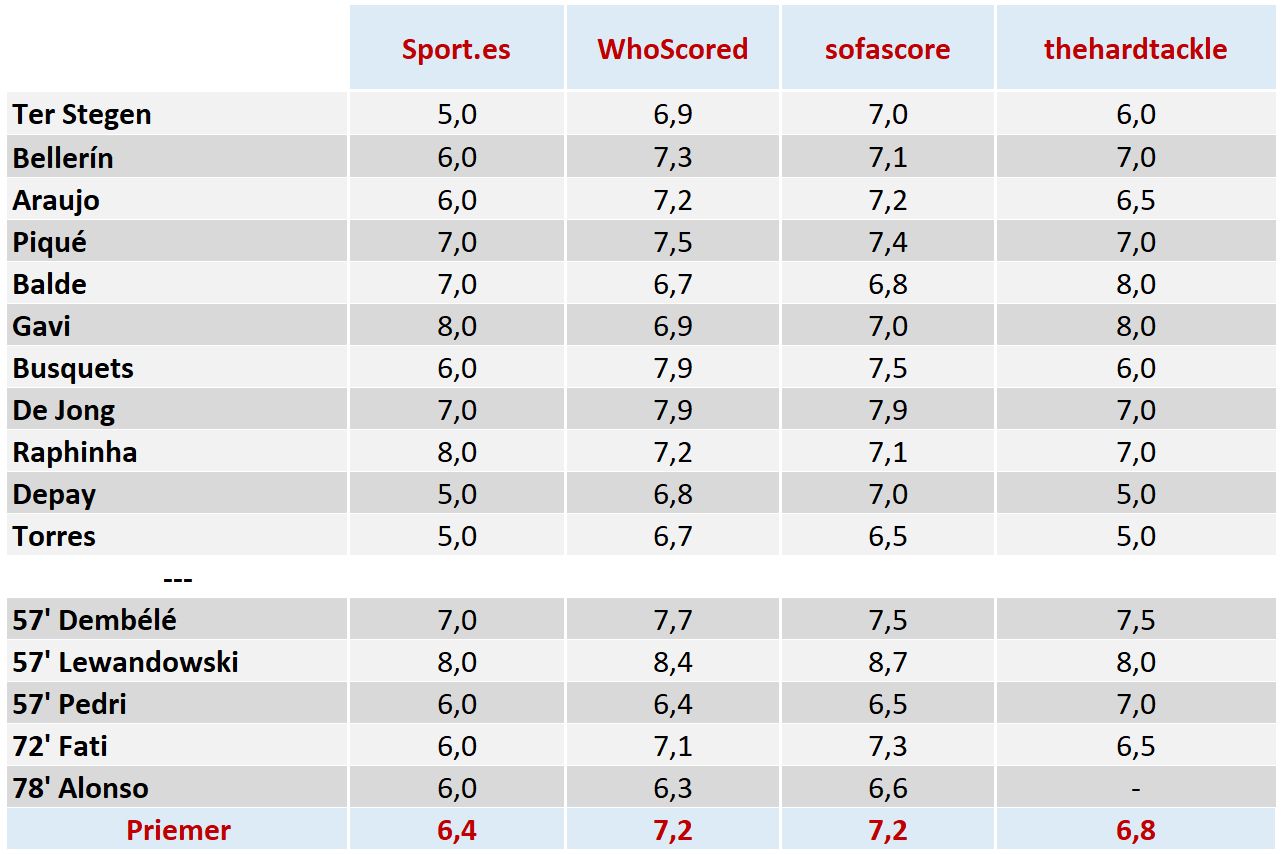 Hodnotenie hráčov bolo zostavené podľa nasledovného kľúča -> do úvahy sme brali 2 subjektívne zdroje: hodnotenie portálu thehardtackle.com a hodnotenie katalánskeho denníka Sport a potom hodnotenie dvoch štatistických portálov Whoscored.com a sofascore.com. Pri každom hráčovi je priemer známok z týchto 4 zdrojov s komentárom portálu thehardtackle.com. Kompletné čísla nájdete v tabuľke na konci článku.