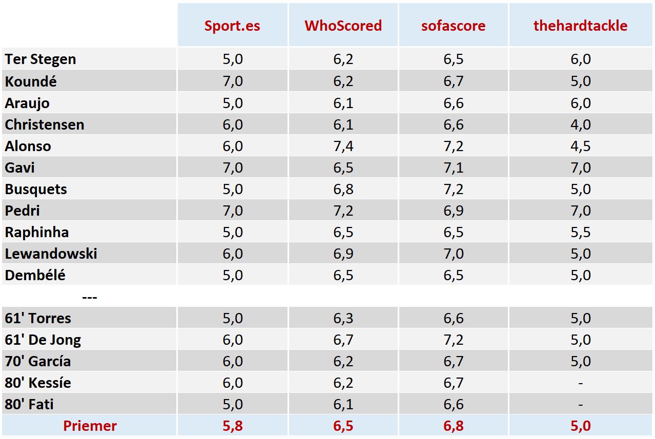 Hodnotenie hráčov bolo zostavené podľa nasledovného kľúča -> do úvahy sme brali 2 subjektívne zdroje: hodnotenie portálu thehardtackle.com a hodnotenie katalánskeho denníka Sport a potom hodnotenie dvoch štatistických portálov Whoscored.com a sofascore.com. Pri každom hráčovi je priemer známok z týchto 4 zdrojov s komentárom portálu thehardtackle.com. Kompletné čísla nájdete v tabuľke na konci článku.