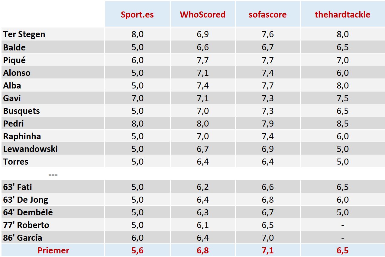 Hodnotenie hráčov bolo zostavené podľa nasledovného kľúča -> do úvahy sme brali 2 subjektívne zdroje: hodnotenie portálu thehardtackle.com a hodnotenie katalánskeho denníka Sport a potom hodnotenie dvoch štatistických portálov Whoscored.com a sofascore.com. Pri každom hráčovi je priemer známok z týchto 4 zdrojov s komentárom portálu thehardtackle.com. Kompletné čísla nájdete v tabuľke na konci článku.
