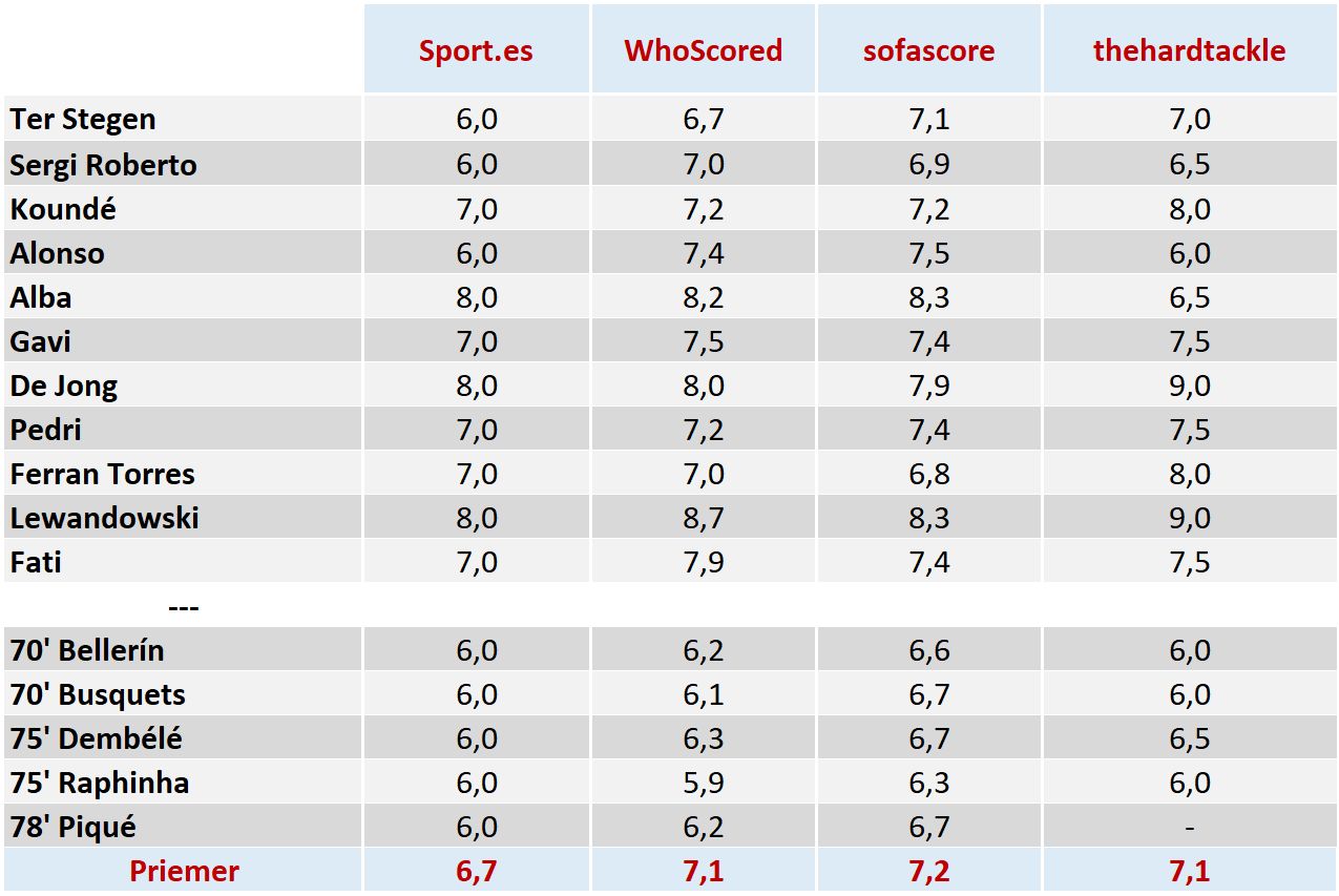Hodnotenie hráčov bolo zostavené podľa nasledovného kľúča -> do úvahy sme brali 2 subjektívne zdroje: hodnotenie portálu thehardtackle.com a hodnotenie katalánskeho denníka Sport a potom hodnotenie dvoch štatistických portálov Whoscored.com a sofascore.com. Pri každom hráčovi je priemer známok z týchto 4 zdrojov s komentárom portálu thehardtackle.com. Kompletné čísla nájdete v tabuľke na konci článku.