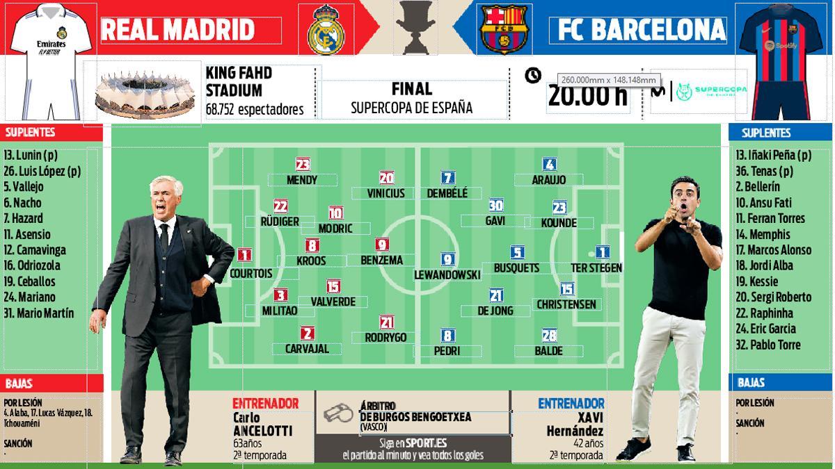 Je to nesmierne náročný, ale aj prestížny súboj. Je zrejmé, že ako Real, tak aj Barcelona pošlú na ihrisko svoju once de gala, teda to najlepšie, čo majú v súčasnosti k dispozícii. Na strane Blaugranas je v každom prípade viacero otáznikov. Nie je zrejmé, či sa Xavi pokúsi zmeniť systém alebo zostane verný klasickému rozostaveniu 4-3-3. Nie je jasné aj to, či na pravej obrane zahrá Koundé ako doteraz, alebo úlohu brániť Viniciusa bude mať na starosti Araujo. Španielske športové denníky ponúkajú svoj pohľad na možné zostavy oboch celkov.