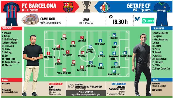 Xavi bude musieť zostaviť základ na zápas proti Getafe bez Roberta Lewandowskeho a Ferrana Torresa, ale aj bez Memphisa Depaya, ktorý prestúpil do Atlética Madrid. V bránke je istý Marc-André ter Stegen. V obrane pravdepodobne dôjde k niekoľkým zmenám. Na pravej strane uvidíme Baldeho a na ľavej Jordiho Albu. Stopérsku dvojicu vytvoria Andreas Christensen a Jules Koundé. V zálohe sa očakáva klasika: Busquets - Gavi - Pedri. Jediné isté miesto v ofenzíve má Ansu Fati, čo včera potvrdil Xavi. A zrejme aj Dembélé s Raphinhom.