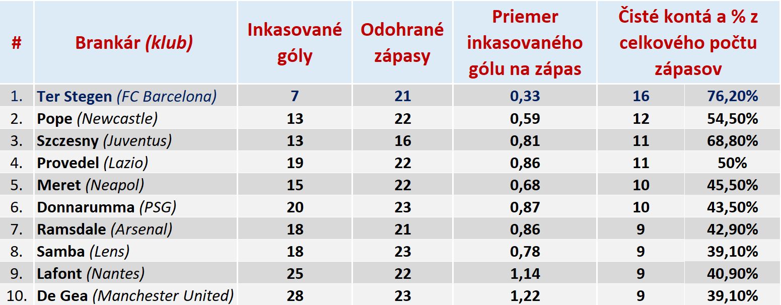 Brankár FC Barcelona Marc-André ter Stegen je najlepším brankárom v piatich najlepších európskych ligách, keď v prvých 21 zápasoch La Ligy inkasoval len 7 gólov. Nemecký brankár Barcelony má najlepší priemer v Európe: 0,33 inkasovaného gólu na zápas, gól dostane každých 270 minút alebo jeden gól každé 3 zápasy. Ter Stegen si tiež udržal 16 čistých kont z 21 možných zápasov - 76,2%. Fantastická forma.