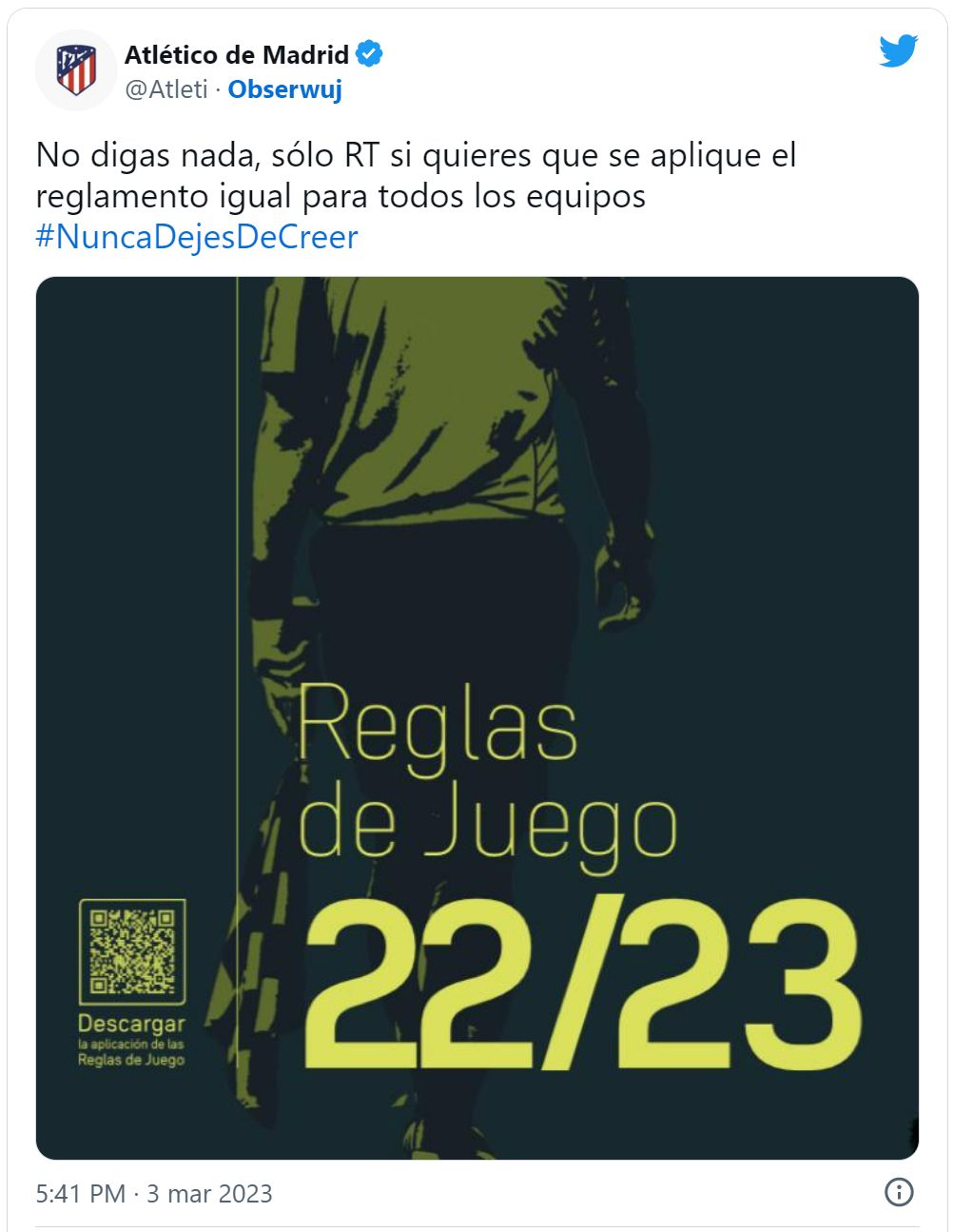 Madridský klub pridal na svoj Twitter príspevok s titulkom: "Nehovorte nič, len RT (pošlite to ďalej), ak chcete, aby sa pravidlá uplatňovali rovnako na všetky tímy" a doplnil hashtag so sloganom: "NuncaDejesDeCreer" (v preklade: nikdy neprestaňte veriť).