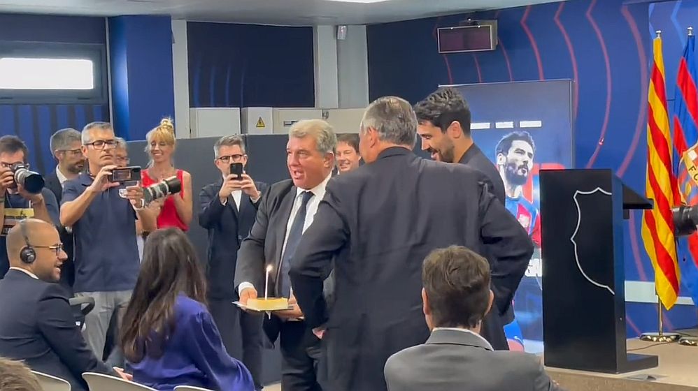 Na záver konferencie priniesol Joan Laporta narodeninovú tortu pre Gündoğanovu manželku: