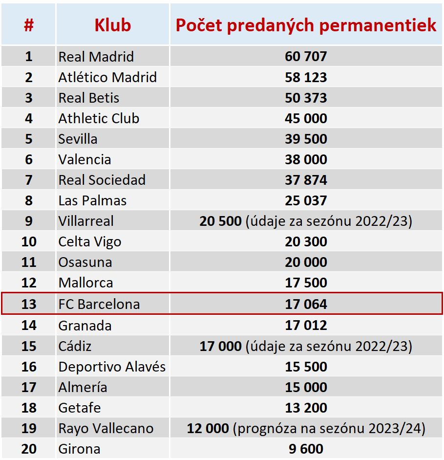 Blaugranas sa nachádzajú v dolnej polovici tabuľky, medzi Mallorcou (17 500 permanentiek) a Granadou (17 012). Na druhej strane Girona predala najmenej permanentiek (9 600), čo však súvisí s mizernou kapacitou Estadio Montilivi.