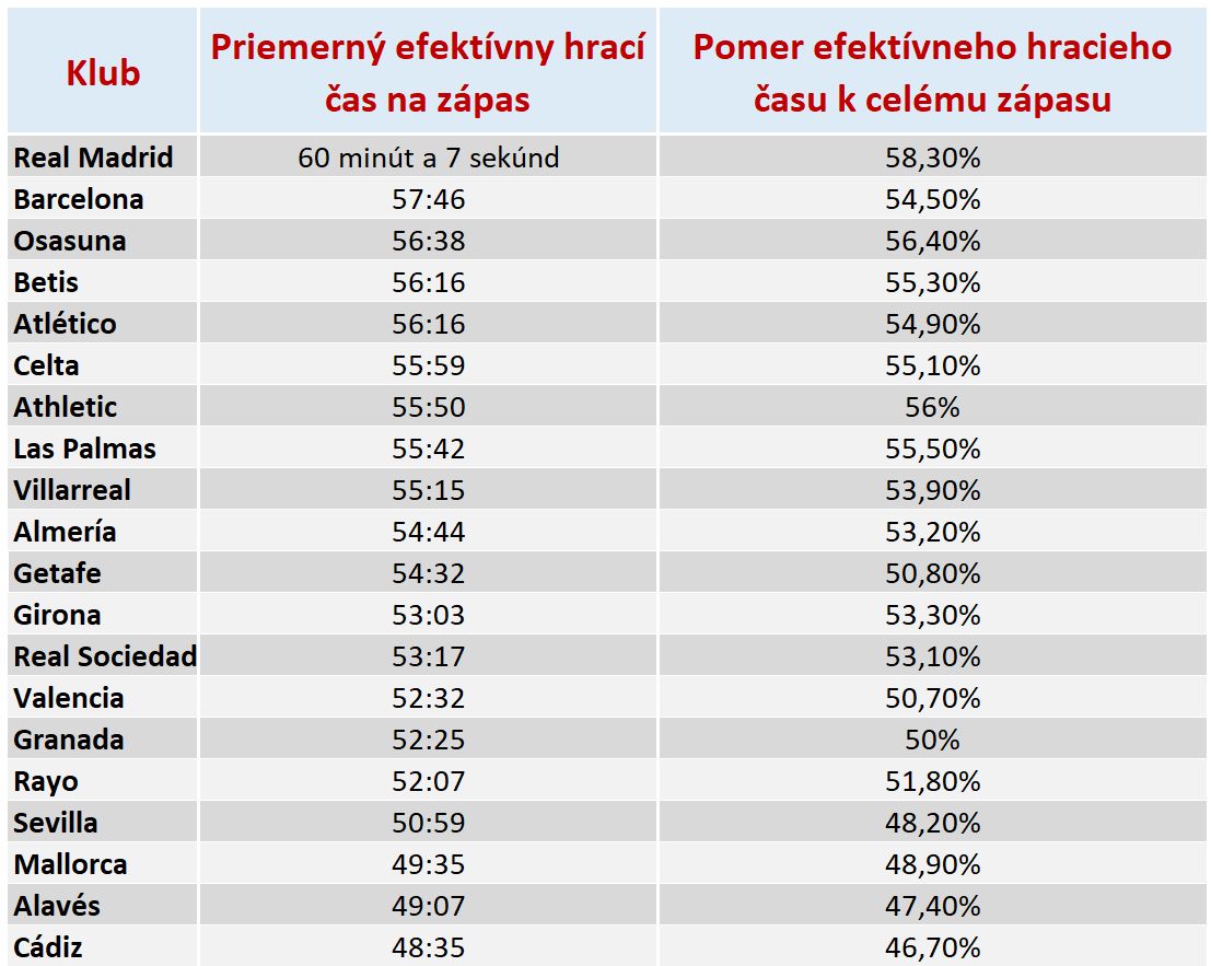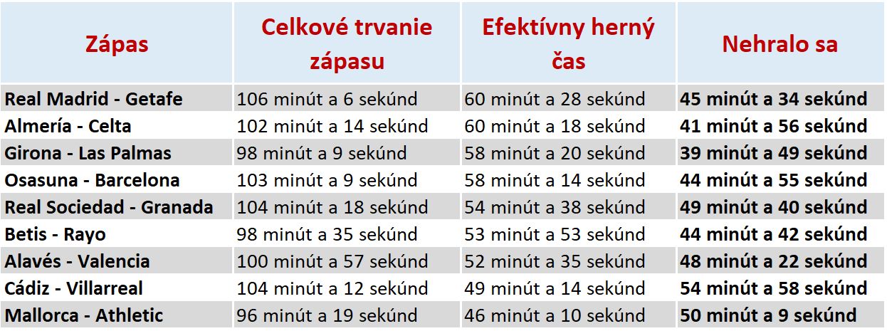 Efektívny hrací čas je v La Lige už dlhodobo veľkým problémom. Zápasy týchto súťaží sú plné prerušení, ktoré znižujú atraktivitu športového zápolenia. Najnovšie údaje v tejto veci predložila spoločnosť Opta.