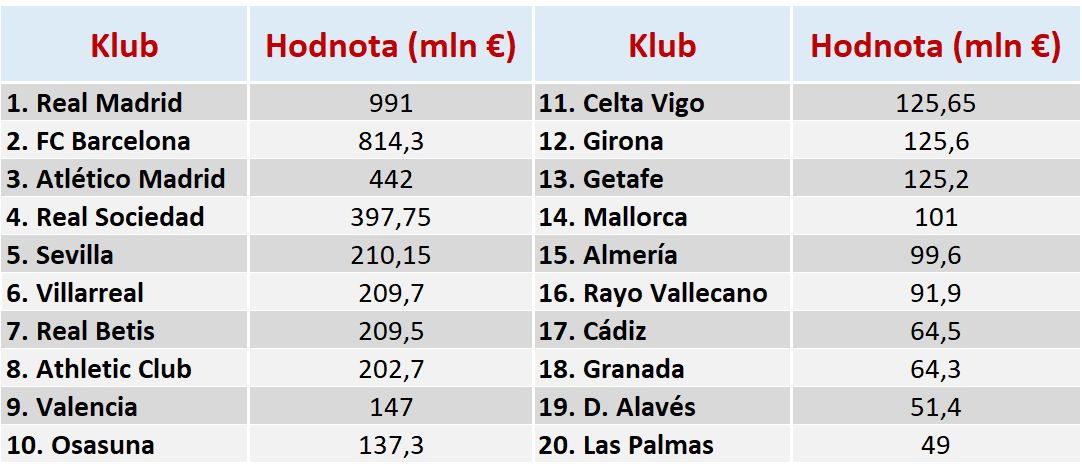 Napríklad Atlético Madrid má hodnotu 442 miliónov eur a na štvrtom mieste medzi španielskymi klubmi je Real Sociedad (397,75 milióna eur). Najnižšiu hodnotu v Primera División má tím Las Palmas (49 miliónov eur).