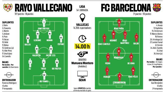 Rayo sa v súčasnosti nachádza na 10. pozícii v La Lige a hoci doma v prebiehajúcej sezóne vyhralo 1 zápas zo šiestich (3 remízy, 2 prehry), Barcelona v posledných rokoch nevie Rayo poraziť. Navyše je zrejmé, že hráči po reprezentačnej prestávke majú v nohách množstvo minút. Xavi na včerajšej tlačovej konferencii priznal, že pri skladaní základu bude brať do úvahy aj tento faktor.