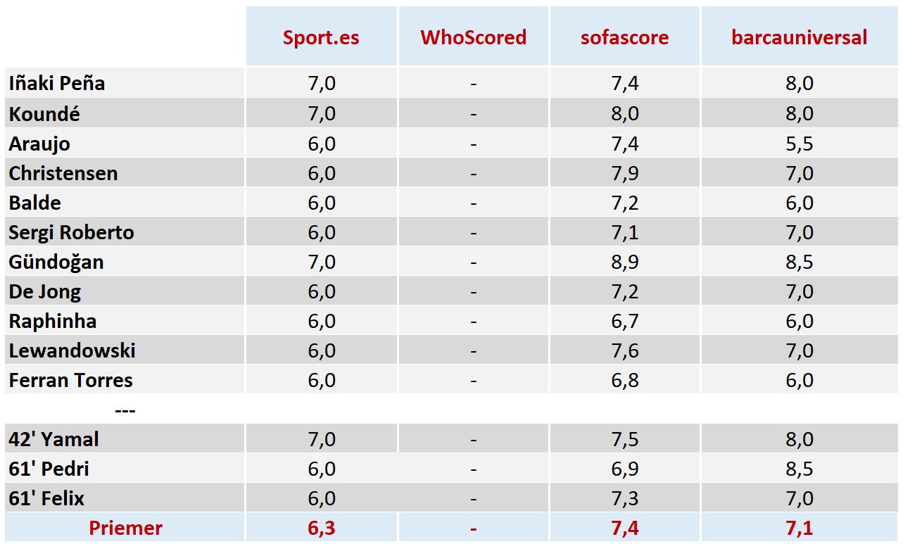 Hodnotenie hráčov bolo zostavené podľa nasledovného kľúča -> do úvahy sme brali 2 subjektívne zdroje: hodnotenie portálu barcauniversal.com a hodnotenie katalánskeho denníka Sport a potom hodnotenie jedného štatistického portálu sofascore.com. Whoscored.com tento zápas nehodnotil. Pri každom hráčovi je priemer známok z týchto 3 zdrojov s komentárom portálu barcauniversal.com.