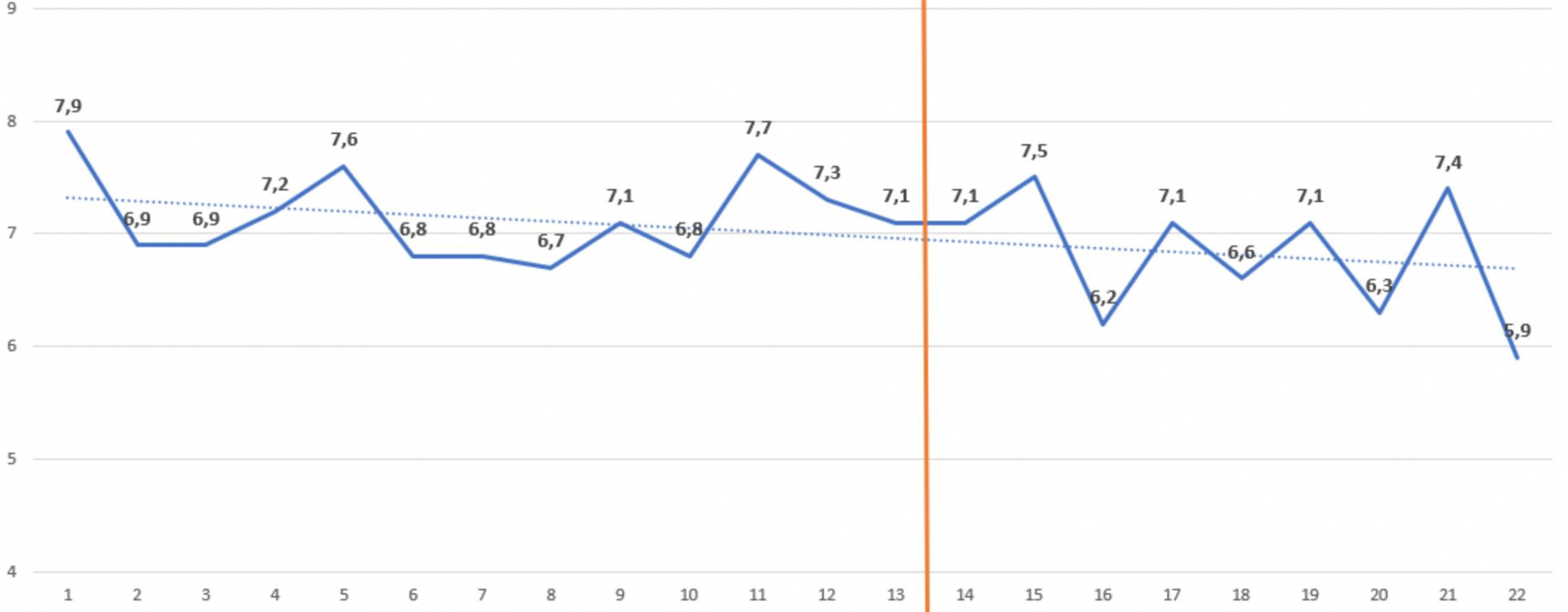 Ako je zrejmé, nedochádza k drastickému poklesu, ale zníženie formy je skutočne zjavné. Priemerné hodnotenie pred 27. novembrom na 7,1; a od 27. novembra do súčasnosti je 6,8.