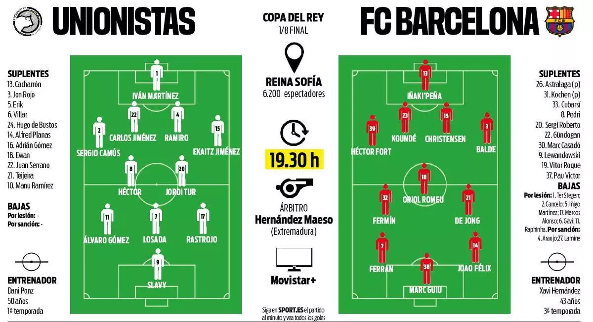 Barcelona: Iñaki Peña; S. Roberto, Koundé, Christensen, Balde; De Jong, Oriol Romeu, Fermín; Ferran, Lewandowski a João Félix.