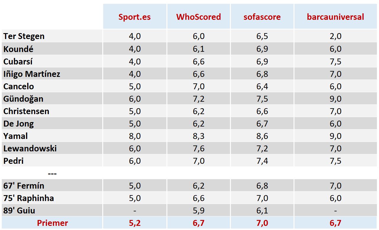 Hodnotenie hráčov bolo zostavené podľa nasledovného kľúča -> do úvahy sme brali 2 subjektívne zdroje: hodnotenie portálu barcauniversal.com a hodnotenie katalánskeho denníka Sport a potom hodnotenie dvoch štatistických portálov Whoscored.com a sofascore.com. Pri každom hráčovi je priemer známok z týchto 4 zdrojov s komentárom portálu barcauniversal.com.