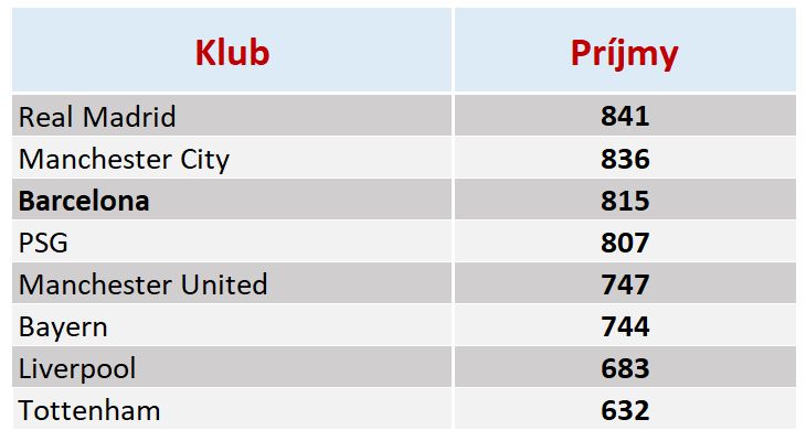 Z hľadiska príjmov sa Barça umiestnila na treťom mieste (815 miliónov eur). Predbehol ju Real Madrid (841 miliónov) a Manchester City (836), za Kataláncami sa umiestnili PSG (807), Manchester United (747) a Bayern Mníchov (744). Barcelona by možno bola vyššie, keby nevypadla už v skupinovej fáze Ligy majstrov.