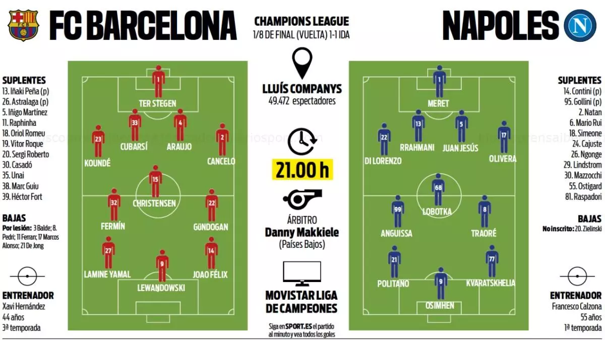 Lewandowski nastúpi na hrote a bude mať k dispozícii Lamineho Yamala na pravej strane. Posledná pozícia na ľavom krídle je pre Xaviho dilemou, pretože bude musieť vyriešiť, či sa rozhodne pre útočníka ako João Felix, alebo namiesto neho nastúpi Fermín López a zvolí štvorčlennú stredovú formáciu.