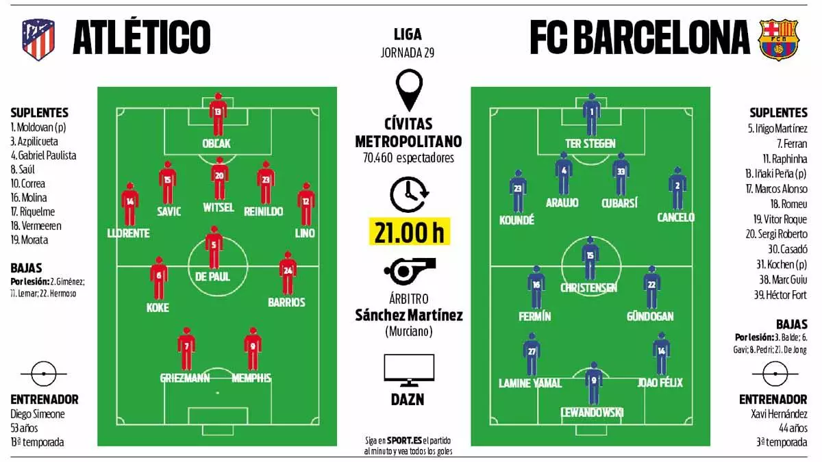 Hoci Barcelona pred niekoľkými dňami odohrala ťažký zápas proti Neapolu, ťažko očakávať, že Xavi bude niekoho šetriť v takom dôležitom súboji, ako je ten proti Atléticu. Zaujímavé je, že väčšina médií tipuje účasť Joãa Felixa, ktorý by mohol byť na Wanda Metropolitano prijatý veľmi negatívne. Španielske denníky svoje prognózy zverejnili ešte pred oznámením správy o absencii Joãa Cancela.