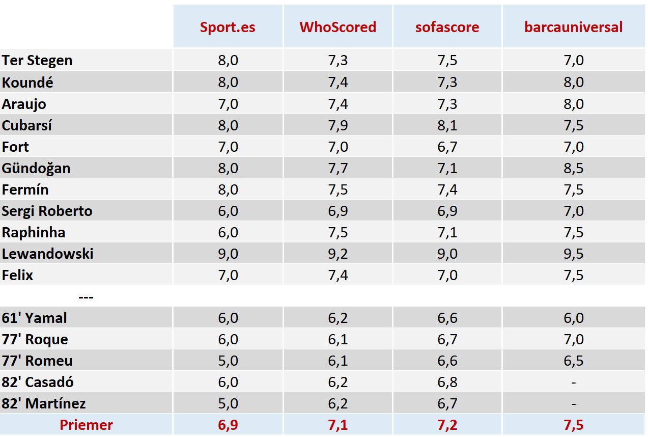 Hodnotenie hráčov bolo zostavené podľa nasledovného kľúča -> do úvahy sme brali 2 subjektívne zdroje: hodnotenie portálu barcauniversal.com a hodnotenie katalánskeho denníka Sport a potom hodnotenie dvoch štatistických portálov Whoscored.com a sofascore.com. Pri každom hráčovi je priemer známok z týchto 4 zdrojov s komentárom portálu barcauniversal.com.
