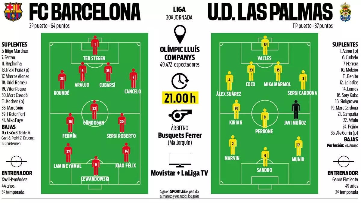 Je zjavné, že Barcelona musí získať plný počet bodov, ak chce zostať aspoň v teoretickom boji o ligový titul. Po repre brejku to pre Blaugranas nebude jednoduchý súboj, nakoľko sa hráči musí opäť nastaviť na herný štýl klubu. Navyše, Xavimu chýba niekoľko dôležitých hráčov a iní dôležití hráči ako Gündoğan či Lewandowski, sú preťažení. Platí ale, že po Las Palmas má Barcelona voľno až do súboja proti PSG, ktorý je na programe 10. apríla. Rotácia preto nie je úplne nevyhnutná. Kto sa nakoniec dostane do základu? Niečo naznačili už španielske športové denníky vo svojej prognóze.