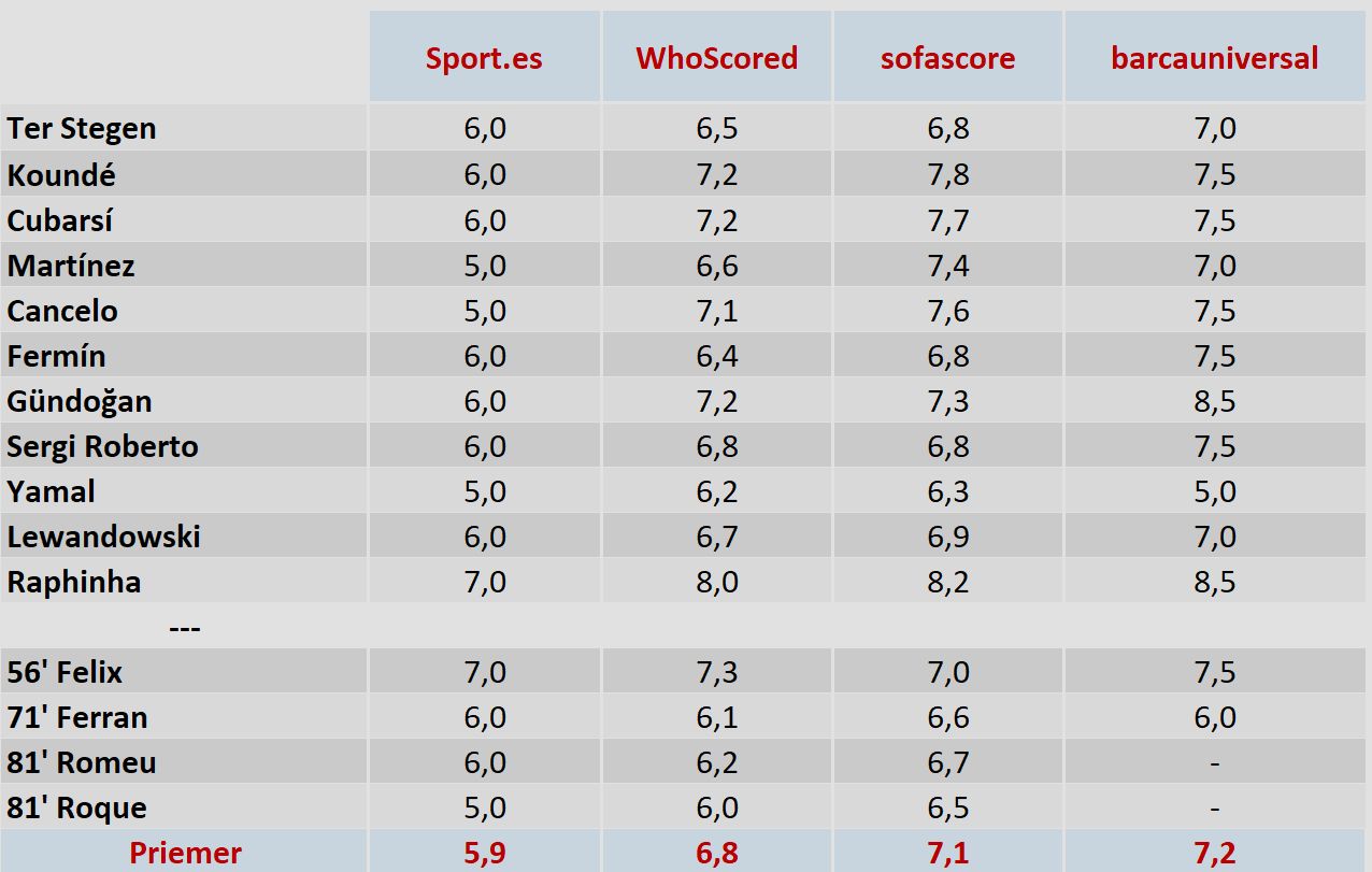 Hodnotenie hráčov bolo zostavené podľa nasledovného kľúča -> do úvahy sme brali 2 subjektívne zdroje: hodnotenie portálu barcauniversal.com a hodnotenie katalánskeho denníka Sport a potom hodnotenie dvoch štatistických portálov Whoscored.com a sofascore.com. Pri každom hráčovi je priemer známok z týchto 4 zdrojov s komentárom portálu barcauniversal.com.