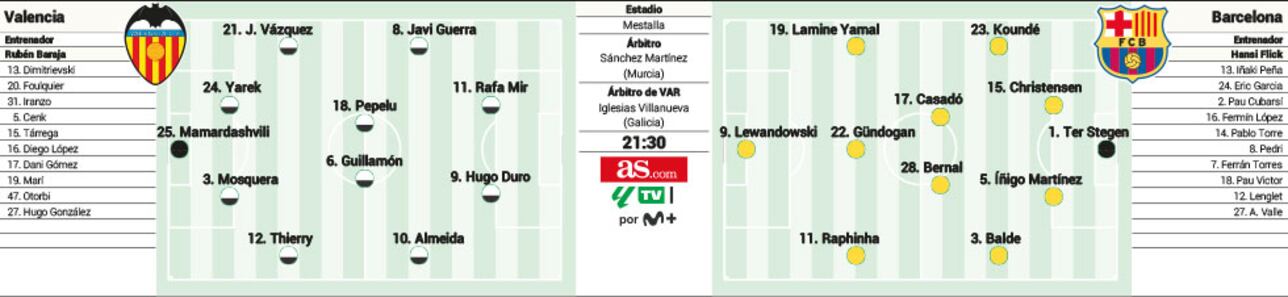 Valencia: Mamardashvili, Thierry, Mosquera, Yarek, Jesús Vázquez, Almeida, Pepelu, Guillamón, Diego López, Rafa Mir a Hugo Duro.