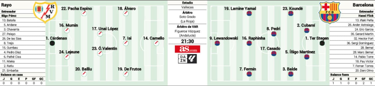 Barcelona: Ter Stege; Koundé, Cubarsí, Íñigo Martínez, Balde; Bernal, Pedri, Raphinha; Lamine Yamal, Ferran a Lewandowski.