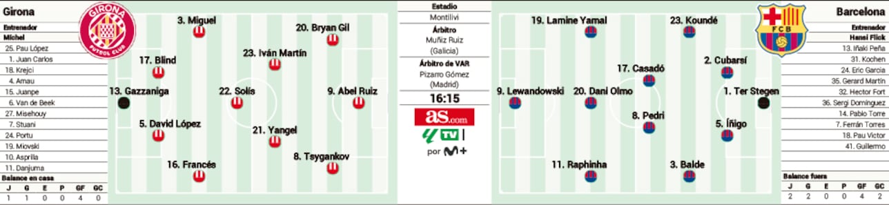 Barcelona: Ter Stegen; Koundé, Cubarsí, Íñigo Martínez, Balde; Casadó, Pedri; Lamine Yamal, Olmo, Raphinha a Lewandowski.