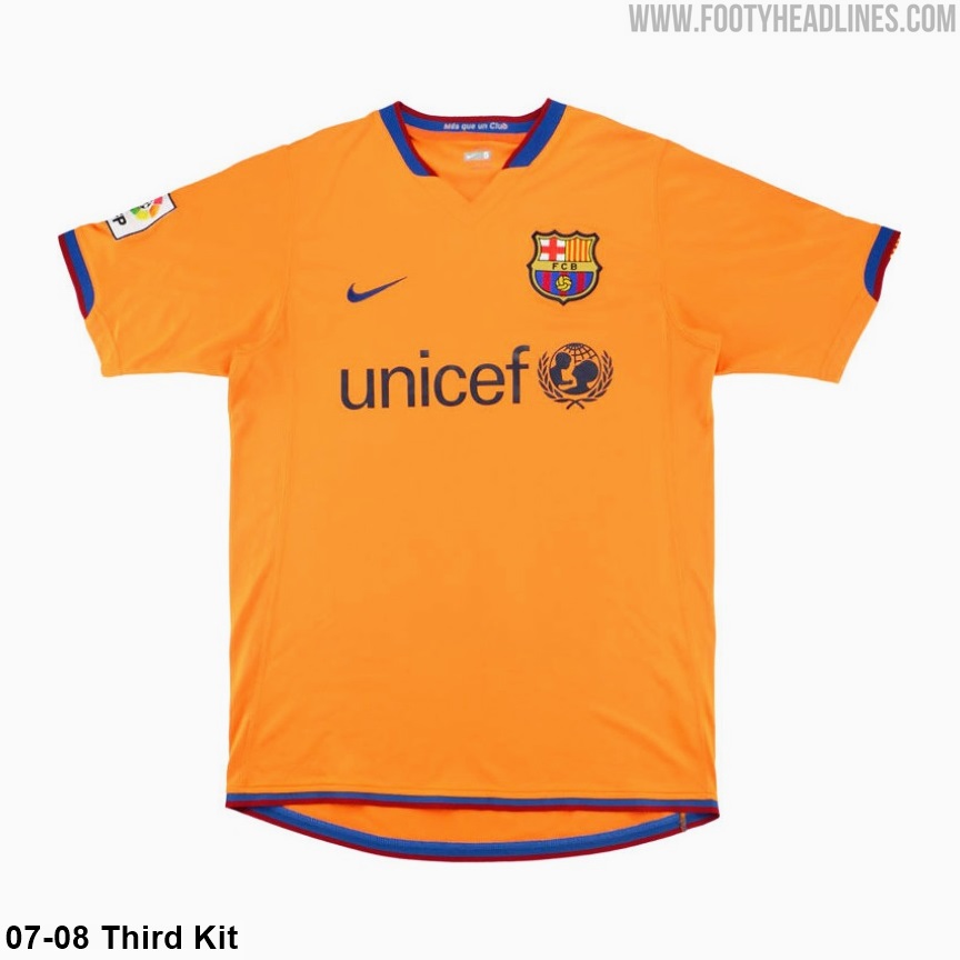 Barcelona naposledy použila oranžovú farbu pred 10 rokmi v sezóne 2014/2015 [na hlavnej snímke] a vtedy to bol výjazdový dres. Čo sa týka tretej sady, oranžová farba bola naposledy použitá v sezóne 2007/2008 [na obrázku nižšie].