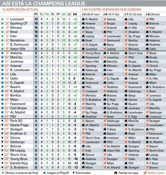 Barcelona má dobrú východiskovú pozíciu, keďže na lídra ligovej fázy Liverpool, ktorý ako jediný dosiahol plný počet víťazstiev v Lige majstrov, stráca len 3 body. Barça však nebude mať ľahkých súperov. Najskôr sa 26. novembra stretne doma s Brestom. Francúzi sú na štvrtom mieste a sú senzáciou súťaže. Vyhrali proti Sturmu Graz, Sparte Praha a RB Salzburg a remizovali s Bayerom. Platia za to ale ťažkosťami v Ligue 1, kde sú na 11. mieste.