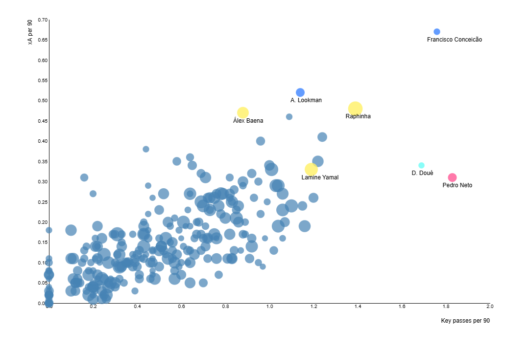 Nasledujúci graf od DataMB zasa ukazuje, ako je na tom Raphinha v porovnaní s ostatnými ofenzívnymi hráčmi (okrem stredných útočníkov) z piatich najsilnejších európskych líg z hľadiska počtu kľúčových prihrávok za 90 minút a miery očakávaných asistencií (xA) za 90 minút. Veľkosť bodu však predstavuje počet odohraných minút.