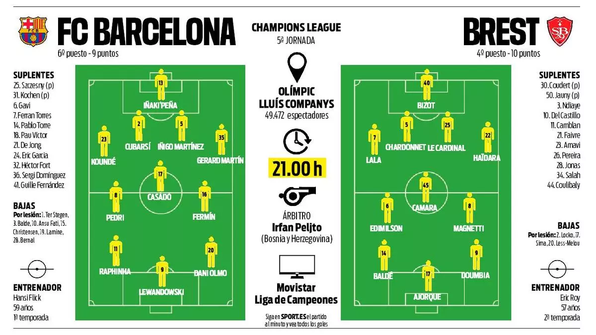Barcelona: Iñaki Peña, Koundé, Cubarsí, Iñigo Martínez, Héctor Fort; Gavi, Pedri; Raphinha, Fermín, Olmo; Lewandowski.