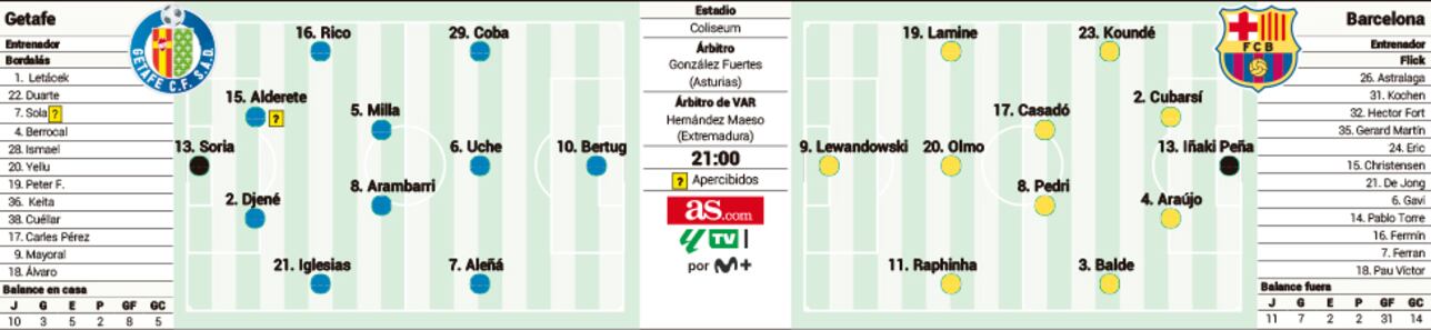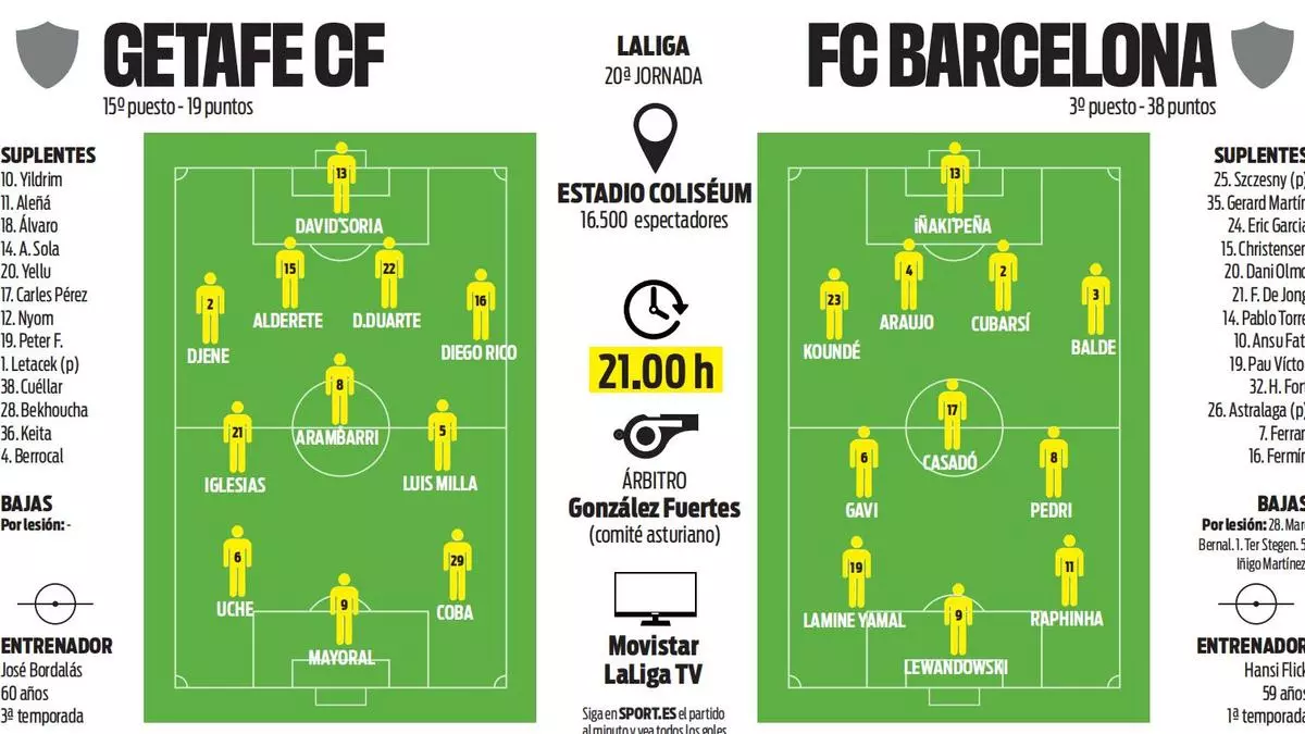 Marc Casadó strávil aj duel s Betisom na lavičke, takže určite bude v základnej zostave. Podobný záver platí aj pre Roberta Lewandowskeho. Flick nedávno povedal, že by mal hrať Pedri, čo naznačuje, že je potom v lepšej fyzickej kondícii, takže predpokladáme, že aj on nastúpi od prvej minúty, aj keď by bolo vhodné dopriať mu pred Ligou majstrov oddych. Posledná poznámka sa týka aj Lamina Yamala a v tomto prípade možno tréner bude svojho hviezdneho hráča trochu šetriť, najviac je zraniteľný voči zákerným zákrokom hráčov Getafe. Zdá sa, že Flick nedôveruje Fermínovi Lópezovi alebo Pablovi Torremu natoľko, aby ich postavil miesto Gaviho.