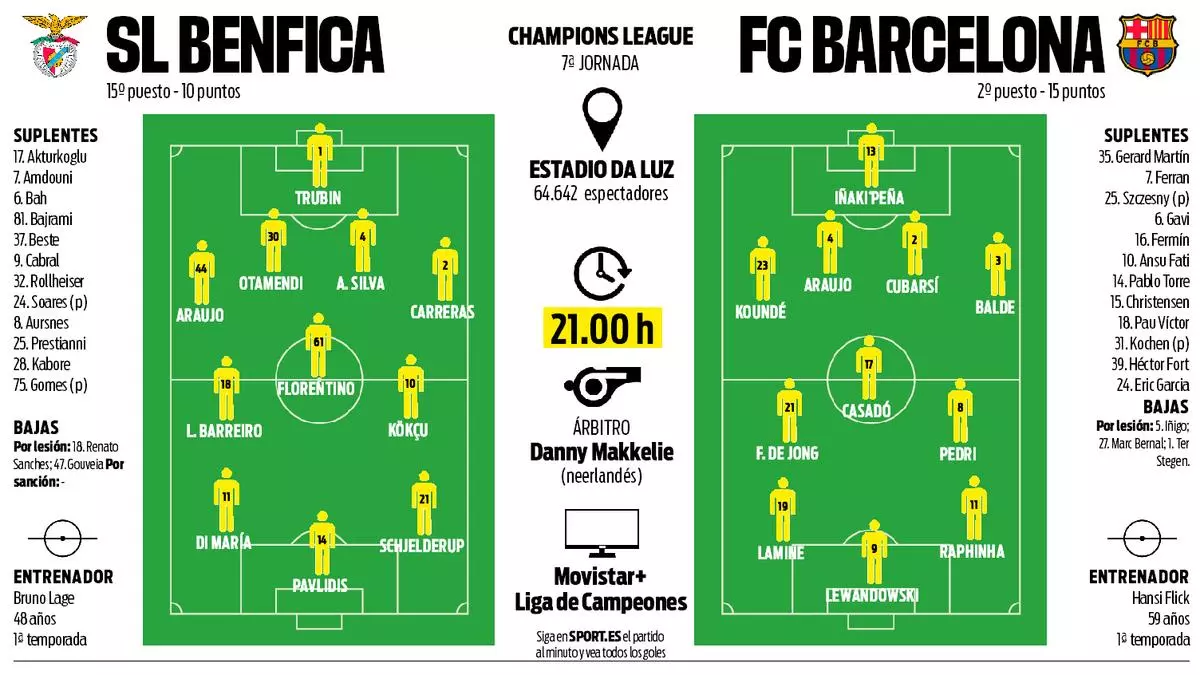 Jednou z hlavných neznámych by mal byť opäť brankársky post Barcelony. Niektorí novinári, ako napríklad Toni Juanmartí či Víctor Navarro, sa domnievajú, že Hansi Flick teraz dá v Lige majstrov šancu Wojciechovi Szczęsnemu. V prognózach sa na Poliaka rozhodol staviť iba madridský denník AS. Ostatní sa domnievajú, že brankársky post bude naďalej hájiť Iñaki Peña. Zvyšok zostavy hostí neprekvapí nikoho. Trochu zmätku sa rozhodol nastoliť katalánsky denník Sport, ktorý sa domnieva, že Gaviho v strede poľa nahradí Frenkie de Jong.