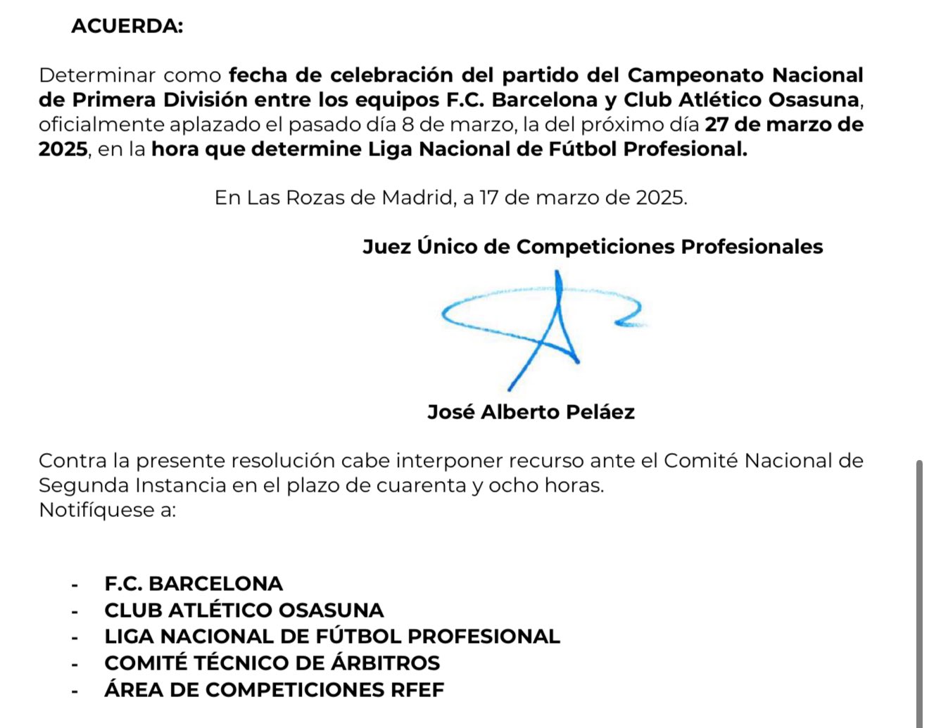 LaLiga uvádza, že odložený zápas Barcelona - Osasuna sa uskutoční vo štvrtok 27. marca v čase, ktorý ešte nebol oznámený. "Proti tomuto rozhodnutiu je možné podať odvolanie na Národný výbor druhej inštancie do 48 hodín," sa uvádza v oznámení.