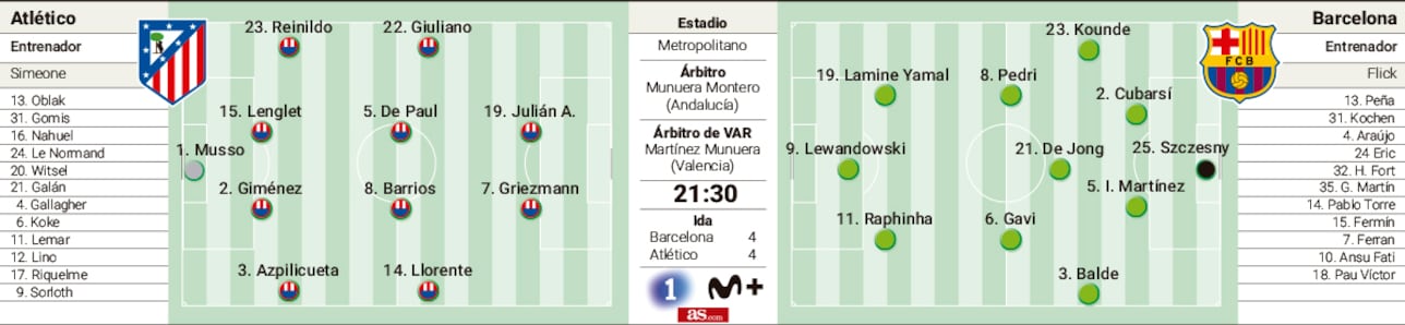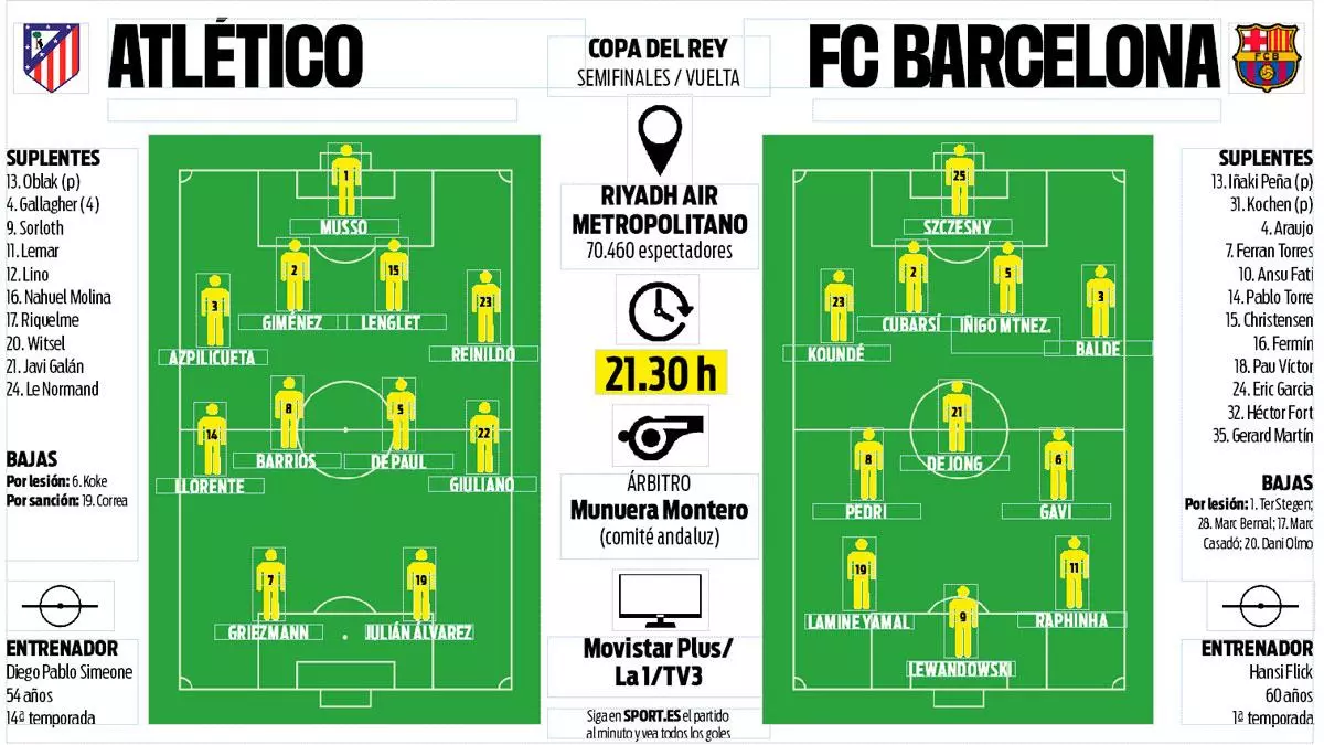 Zdá sa, že Flick pošle do hry takmer rovnakú zostavu ako v prvom zápase s výnimkou pozície číslo 10. Namiesto zraneného Daniho Olma si tam môže zahrať Gavi, ktorý sa v posledných zápasoch javí celkom dobre, a to ako bližšie k súperovej bráne, tak aj nižšie v rozohrávke. Je dosť možné, že Hansi Flick opäť postaví od prvej minúty Ferrana Torresa, ktorému sa v tomto type stretnutí darí, ale nemožno vylúčiť, že vzhľadom na dôležitosť zápasu tréner tentoraz zvolí Lewandowskeho.