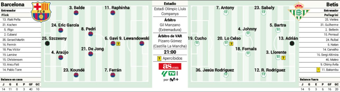 Hansi Flick veľa hovoril o správnom manažovaní síl v tejto záverečnej fáze sezóny. Zmeny očakávame hlavne v strede obrany, kde by namiesto Iñiga a Cubarsího mali hrať Ronald Araujo a Eric García. Očakávame tiež Fermína Lópeza na pozícii číslo 10, duo Frenkie - Pedri v strede poľa a trojicu Lamine - Lewy - Raphinha v útoku.