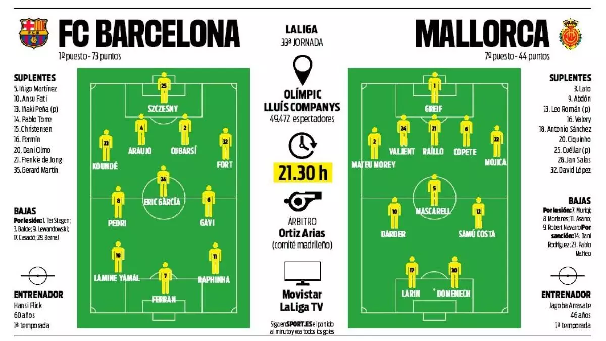 V náročnom zápase musí Hansi Flick rotovať, keďže program je neúprosný a cez víkend čaká Kataláncov El Clásico vo finále Copa del Rey. Navyše je zranený Alejandro Balde a aj Lewandowski. Na ďalších hráčoch ako napríklad Yamal či Pedri sa už začína prejavovať únava z nabitého kalendára. Ako Hansi Flick vyskladá základnú zostavu, to nám približujú prognózy španielskych športových denníkov.