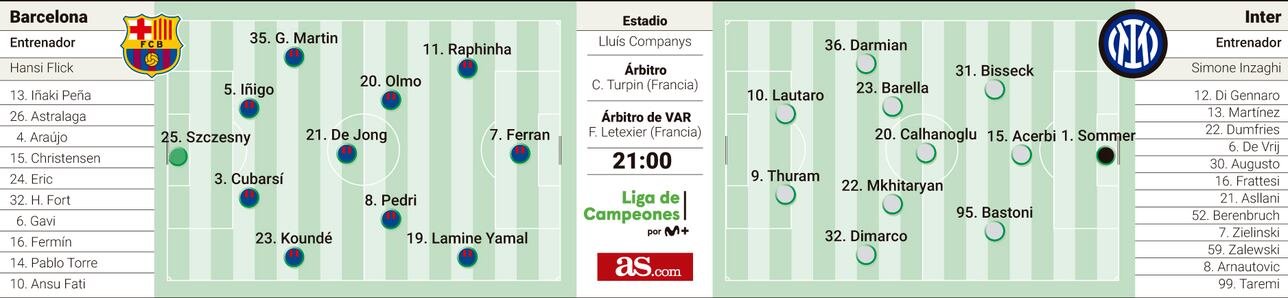 FC Barcelona: Szczęsny; Martín, Íñigo, Cubarsí, Koundé; De Jong, Pedri, Olmo; Raphinha, Ferran a Lamine