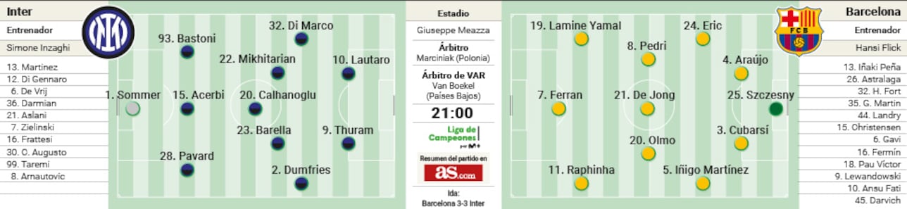 Barcelona: Szczęsny; Eric García, Ronald Araujo, Cubarsí, Iñigo Martínez; De Jong, Pedri; Yamal, Olmo, Raphinha; Ferran Torres.