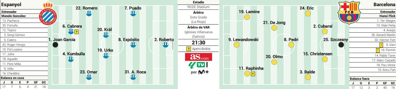 Pokiaľ ide o súpera Barçy, médiá sa zhodujú takmer na celej základnej jedenástke. Jedinou neznámou je, či sa v strede poľa popri Urkovi Gonzálezovi a Edu Expositovi predstaví Pol Lozano alebo Alex Kral.