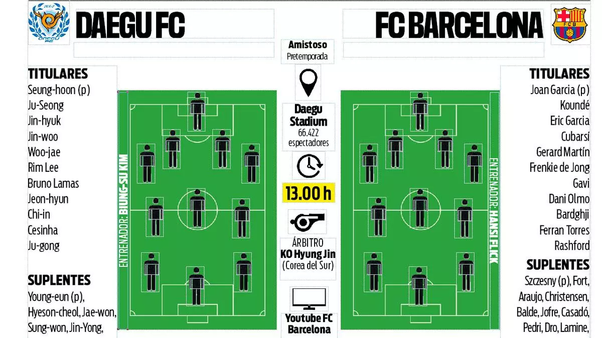 Tretí a zároveň posledný zápas predsezónneho ázijského turné privedie FC Barcelona do mesta Daegu, kde sa postaví proti miestnemu klubu Daegu FC – poslednému tímu juhokórejskej K League 1. Po výhrach nad Vissel Kobe (1:3) a FC Seoul (3:7) tak čaká zverencov Hansiho Flicka ďalší súper, ktorého by papierovo mali zvládnuť s prehľadom.