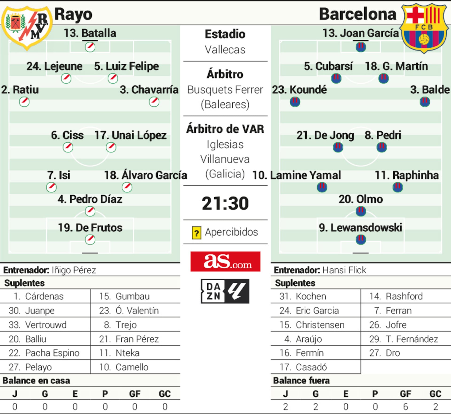 Rayo Vallecano: Batalla; Ratiu, Lejeune, Luiz Felipe, Pep Chavarría; Pathé Ciss, Pedro Díaz; Isi Palazón, Álvaro García, De Frutos a Camello.