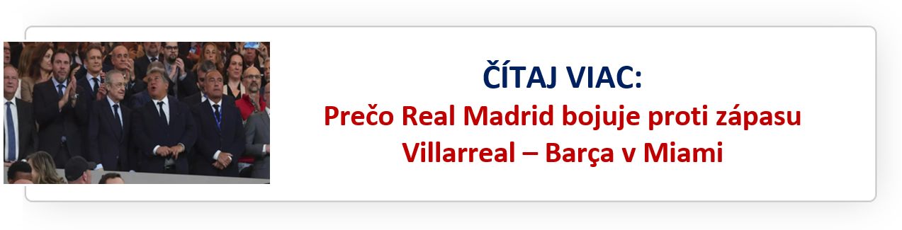 Stále nie je jasné, kde sa odohrá ligový zápas medzi Villarrealom a FC Barcelona – či podľa želania Javiera Tebasa v Miami, alebo v domácom Estadio de la Cerámica. Real Madrid už vyjadril nesúhlas s tým, aby sa stretnutie nehralo na pôde Žltej ponorky. O konečnom rozhodnutí však budú musieť rozhodnúť FIFA a UEFA.