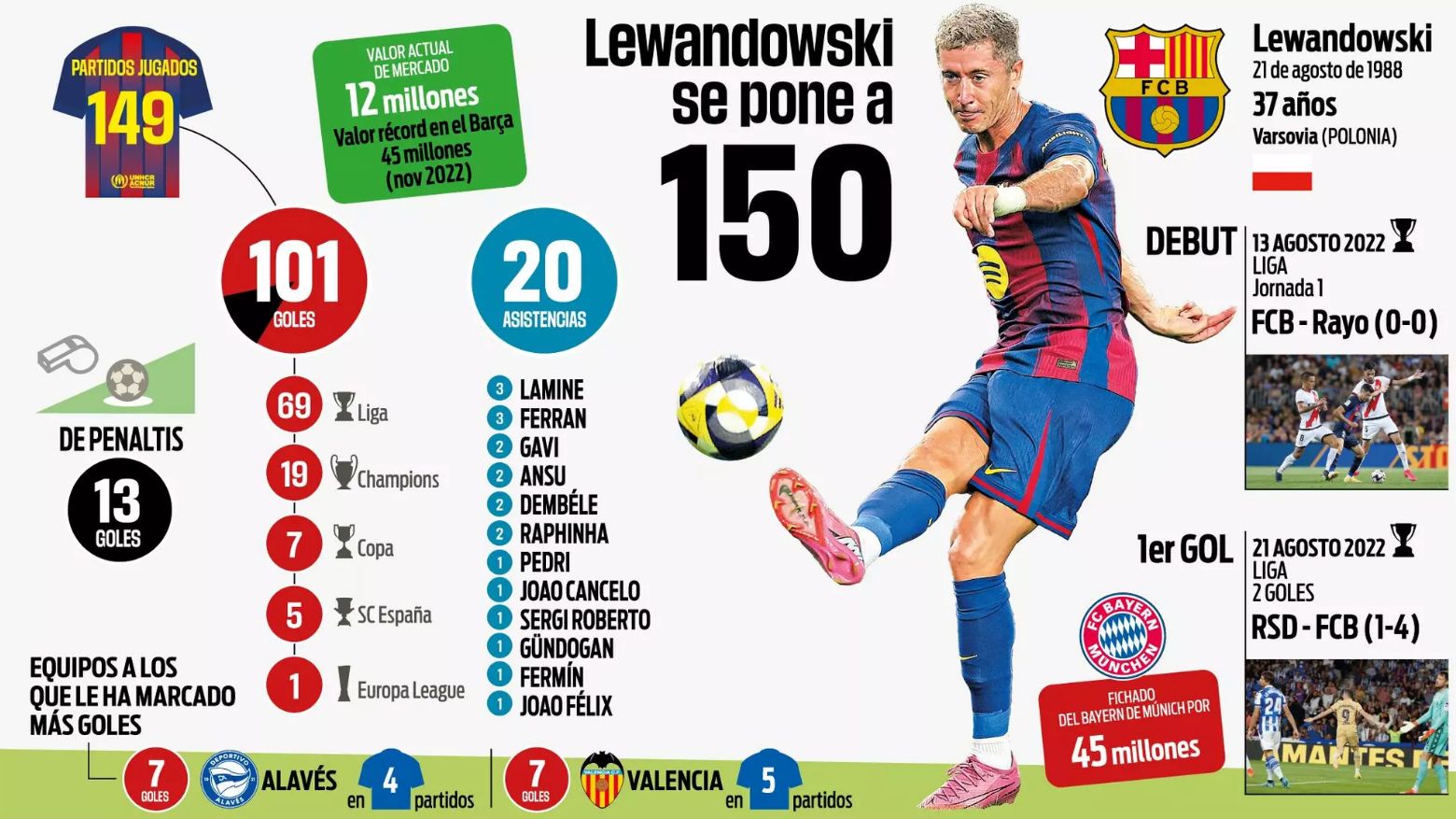 Poľský kanonier nastrieľal Valencii už 7 gólov v 5 zápasoch, čo je spolu s Alavésom jeho najobľúbenejší súper v La Lige. Na Mestalle i na Montjuïc dokázal rozhodovať stretnutia – vrátane hetriku spred dvoch sezón. Celkovo v posledných troch vzájomných dueloch skóroval až šesťkrát.
