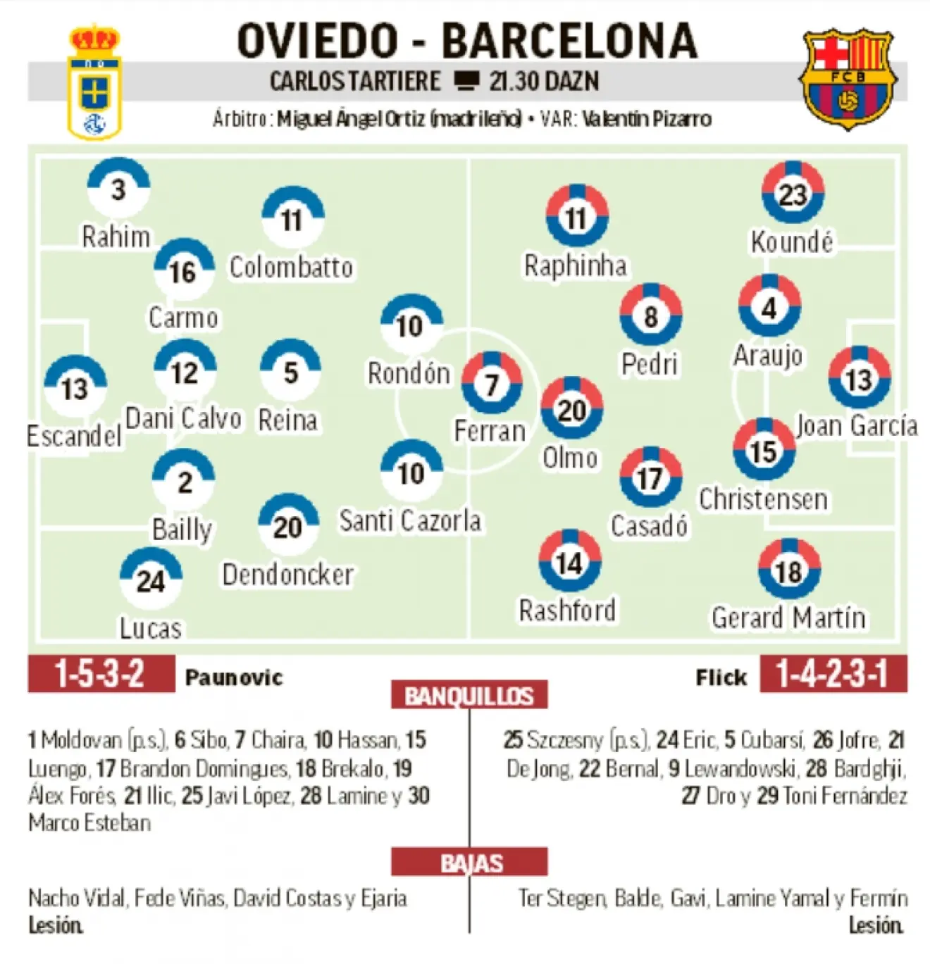 V zostave sa ukáže Santi Cazorla, legenda španielskeho futbalu, ktorý by mal priniesť potrebný pokoj a kreativitu. Oviedo navyše zvažuje systém s tromi stopérmi, podobne ako proti Realu Madrid.