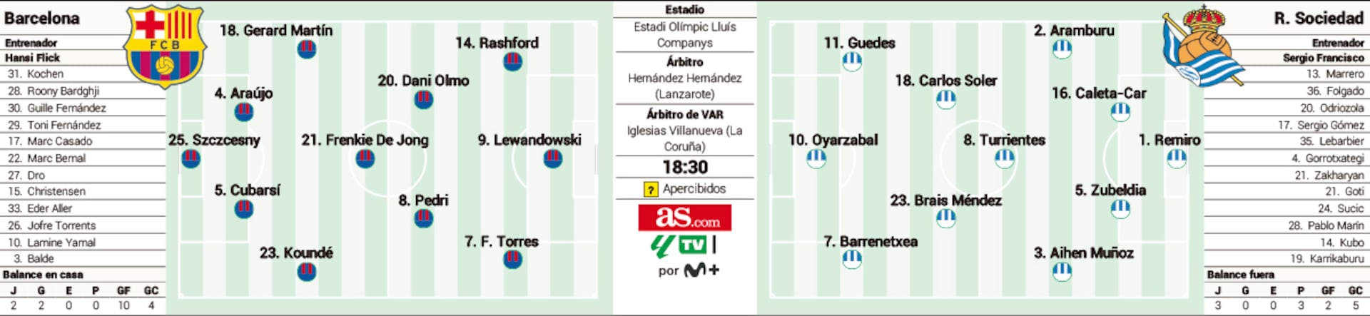 Real Sociedad prichádza na Montjuïc v nelichotivej forme – v šiestich zápasoch prehral trikrát a pohybuje sa blízko zostupovej zóny. Navyše ho trápia aj vlastné absencie. Óskarsson bude mimo až do októbra, Yangel Herrera sa len vracia po svalových problémoch, Aritz Elustondo má zlomené rebrá a Jon Martín je na MS do 20 rokov, no aj tak zranený.