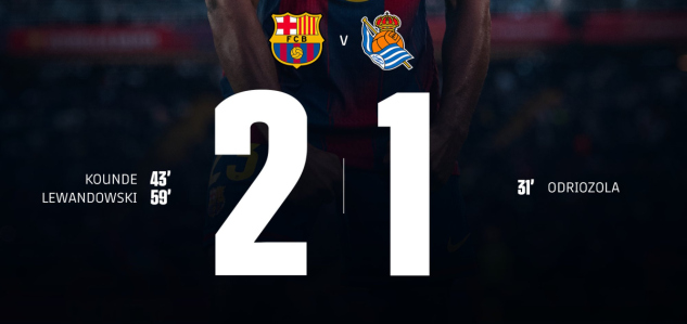 Barcelona zdolala Real Sociedad 2:1 a vrátila sa na čelo LaLigy. Zápas priniesol návrat Lamina Yamala, ktorý okamžite ukázal svoju genialitu a pripravil víťazný gól Robertovi Lewandowskemu. Napriek prevahe domácich ich mohla stáť body slabá efektivita a zbytočné chyby v obrane.