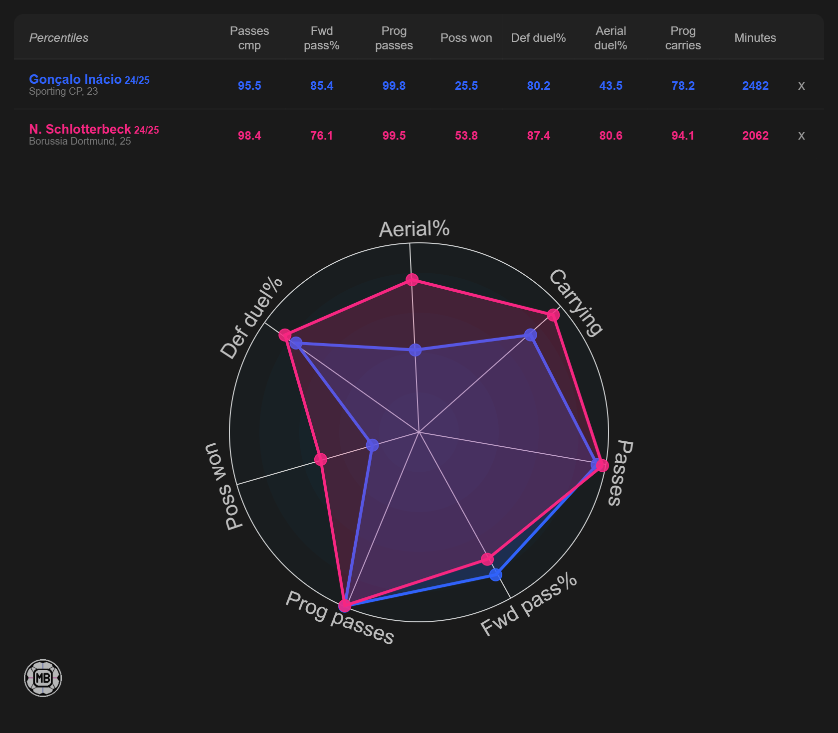 Takto vyzerá porovnanie oboch hráčov pomocou grafu DataMB, ktorý zvýrazňuje štatistiky (zo sezóny 2024/25) užitočné pri analýze hry stopéra, ktorý sa stará o rozohrávku (napr. počet vykonaných prihrávok, percento prihrávok smerom dopredu, percento vyhraných súbojov atď).